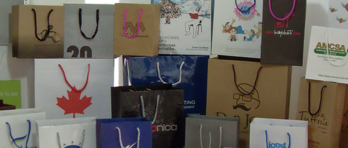 Bolsas de papel kraft, también en papel bond (120 grs) y bolsas en papel couché. Las bolsas de papel couché llevan plastificado (laminado) brillante o mate, para durabilidad y resistencia de la impresión y la bolsa, también se puede aplicar para bolsas kraft o bolsas bond.