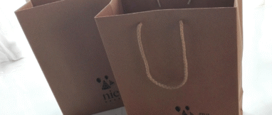 Bolsas de papel kraft Con asas de papel torcido pegadas en pestaña, también trabajamos asas agujeta convencional cordón macramé. Impresión a una tinta (impresas 1 color), logo – texto sencillo.