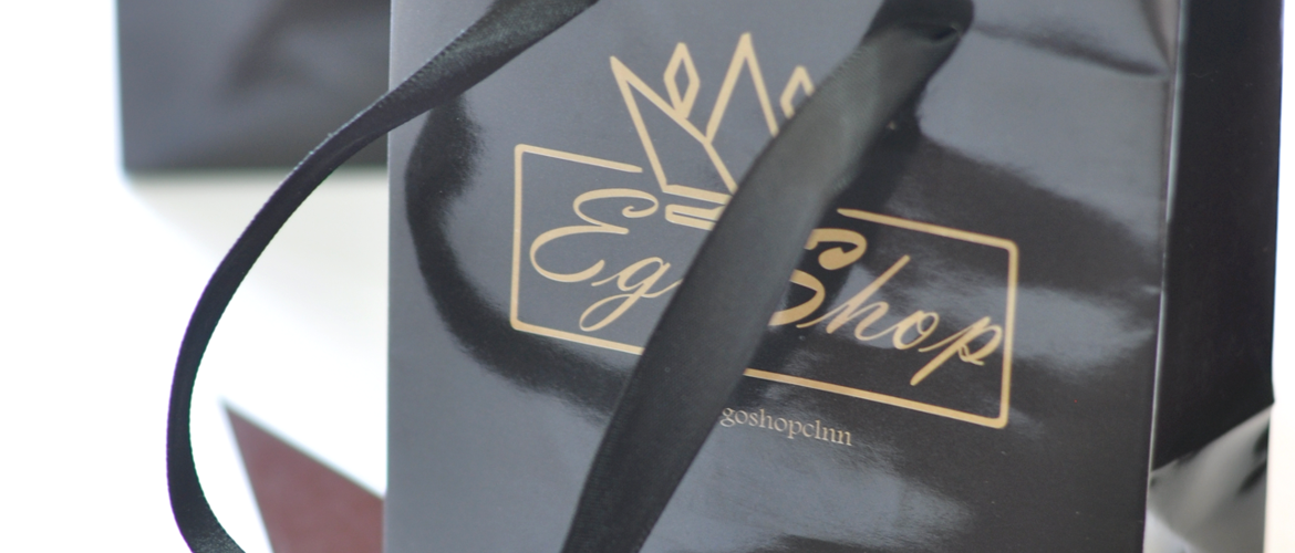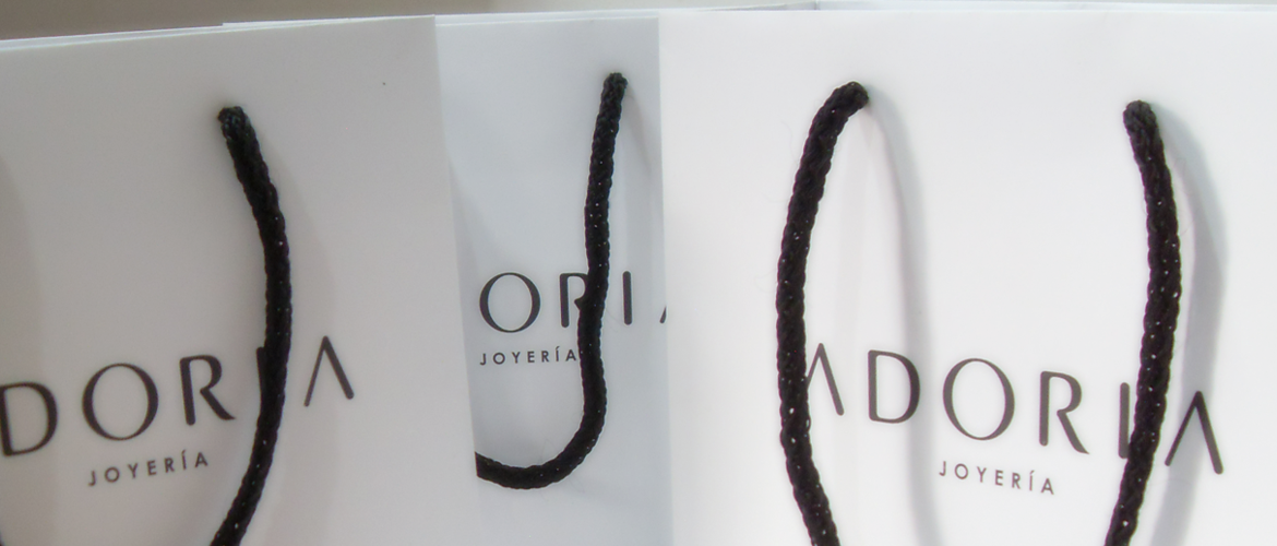 Bolsas de regalo, mercancías, comercio Bolsas couché acabado brillante (laminado brillo), para joyería, shopping y ocasión. Bolsas impresas con logotipo o diseño a una tinta, color negro completo tipo plasta, logo diseño en dorado. Bolsas en papel couché de 130, 150 o 200 grs.