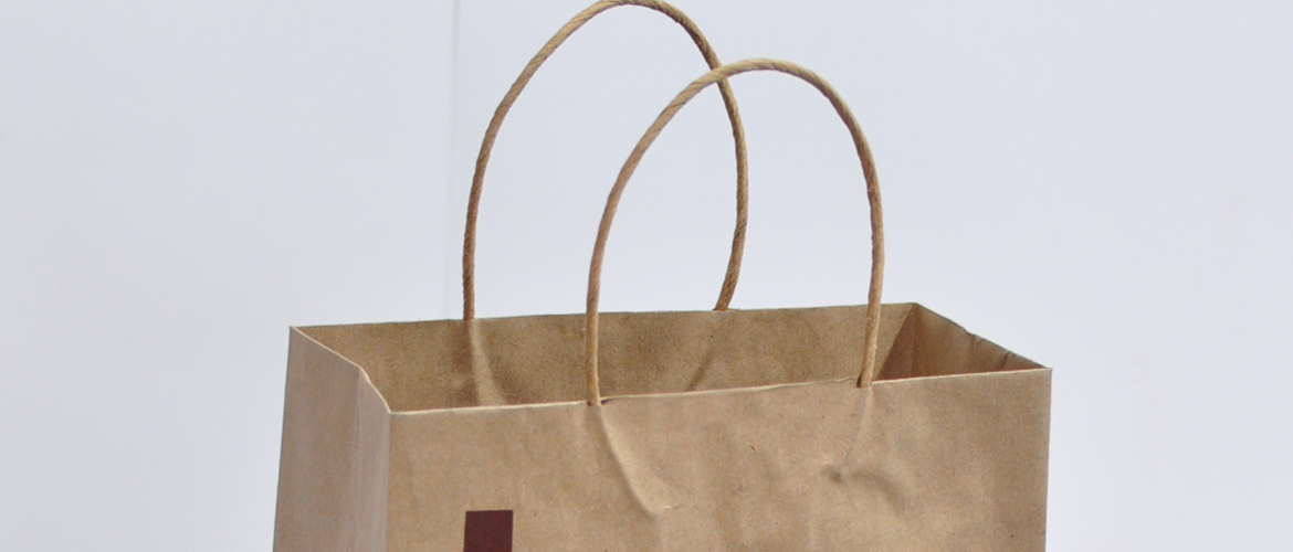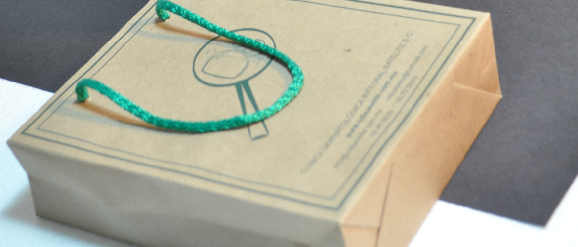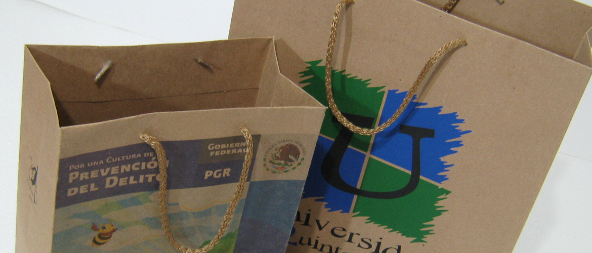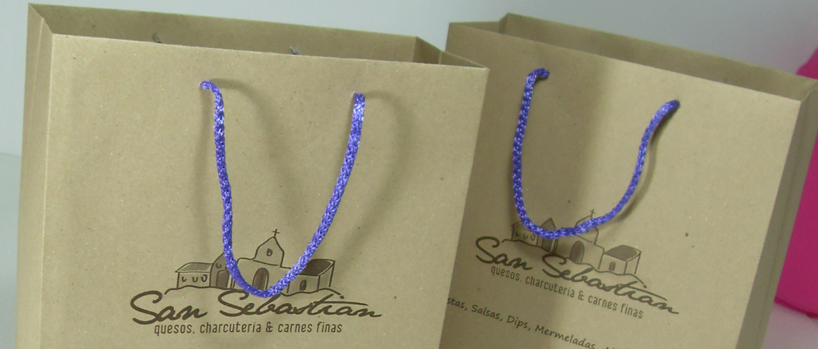 Bolsas de papel kraft Con asas de papel torcido pegadas en pestaña, también trabajamos asas agujeta convencional cordón macramé. Impresión a una tinta (impresas 1 color), logo – texto sencillo.