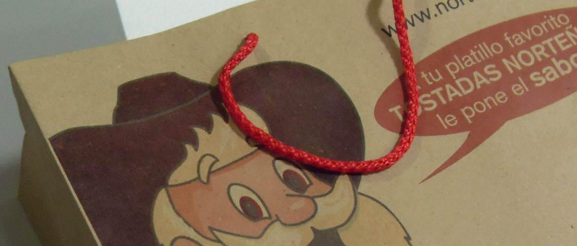 Bolsas en papel kraft Diseño impreso a una tinta, asas macramé agujeta. El gramaje estándar es de 130 grs. equivalente al doble grosor que las bolsas de pan comerciales.