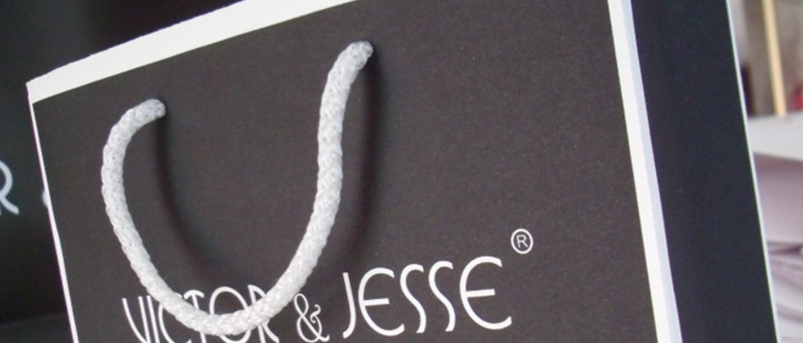 Bolsa impresión en dorado Impresión tipo plasta en tinta dorada, logo y textos calados en blanco, laminado brillante, asas macramé agujeta. Bolsas couché laminado (plastificado).